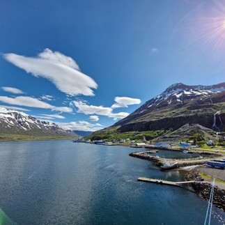 On-shore excursions included a trip to massive waterfalls, sunken blue lake, museums and a natural park where you could see and walk between two continents. The facilities for the tourists were first class with modern information centres at the key attractions. Tourism is Iceland’s largest income earner and it can be very crowded at times but Elise was careful with her photographs so it looked more like an un-spoilt northern landscape. We were shown footage of a group of whales playing not too far away from the ship.
